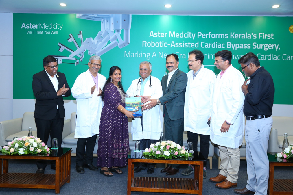 Aster Medcity, one of the best multispecialty hospitals in the country, trusted for its clinical expertise and use of cutting-edge technology, has successfully performed the state’s first-ever robotic-assisted Coronary Artery Bypass Grafting (CABG) surgery, marking a significant advancement in cardiac surgical care. This pioneering procedure was performed on a 42-year-old woman, Nisha Purushothaman. The patient, hailing from Guruvayur, Thrissur Dist. experienced a rapid recovery and was discharged just four days after the surgery.