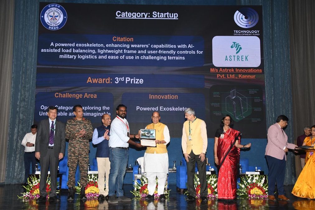 Defense Minister Rajnath Singh presented the award to Alex M Sunny, CTO & Co-founder, Astrek Innovations, at a function held at the DRDO Bhawan in New Delhi. Primarily known for its medical exoskeletons or wearables, which improve strength and mobility, Astrek showcased the technology’s versatile capabilities in military logistics applications.