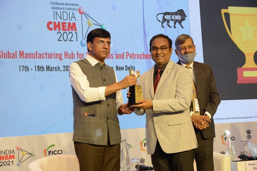 The Company received award for ‘Petroleum Sludge Valorisation’, a novel concept of valorising tank bottom sludge and renewable biomass and generating a versatile solid fuel. Dr. Chiranjeevi Thota, Deputy General Manager (R&D) received the award on behalf of the Company, which was conferred by Mansukh Mandviya, Union Minister of State, Ministry of Chemicals and Fertilizers, Yogendra Tripathi, Secretary, Department of Chemicals and Petrochemicals and Deepak Mehta-Chairman, FICCI Chemical Committee and C&MD Deepak Nitrate Ltd.
