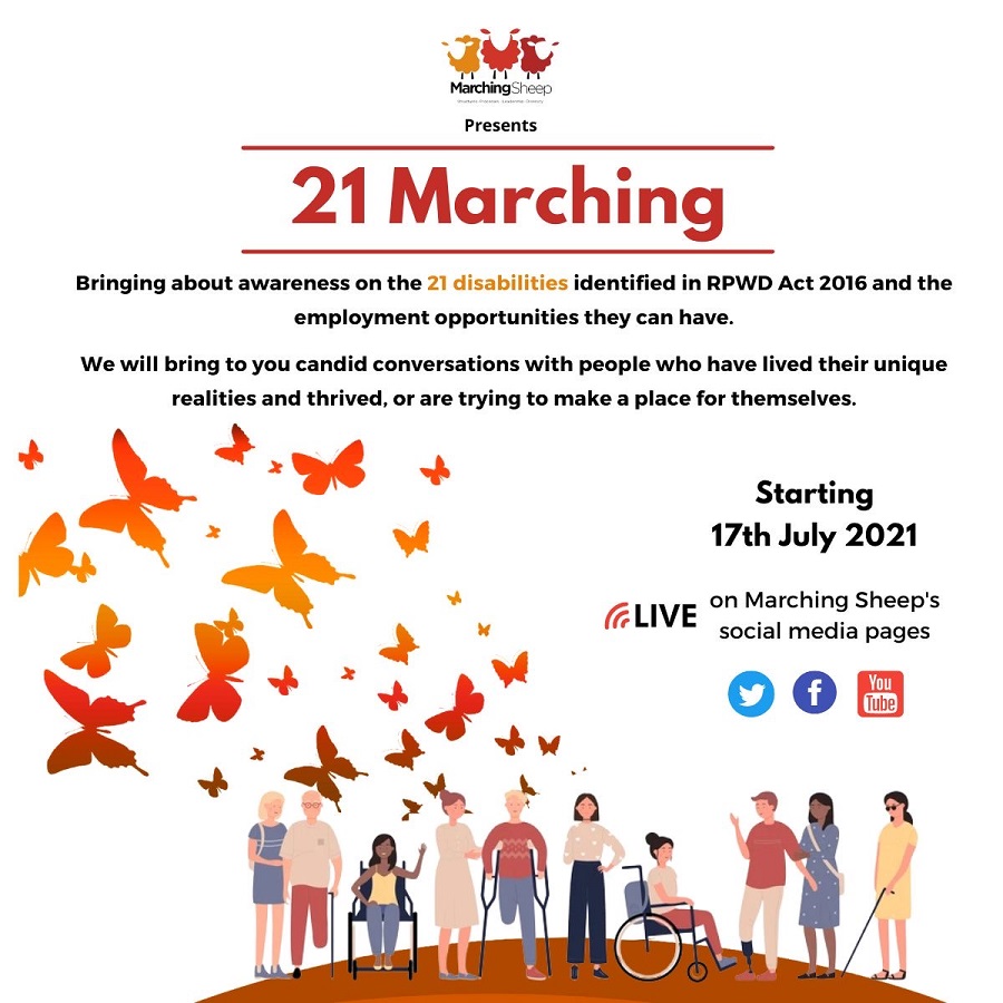 India’s leading HR Consulting firm, Marching Sheep is introducing an initiative for Persons with Disability. The campaign name will be ‘21 Marching’ and will comprise a series of conversations with People with Disability. It is an earnest effort by Marching Sheep to drive awareness about all 21 disabilities covered under the RPWD act 2016. The initiative will help people understand lived realities, challenges, constraints, societal biases, aspirations, dreams, and how these individuals have overcome hurdles to live a life of dignity and independence.