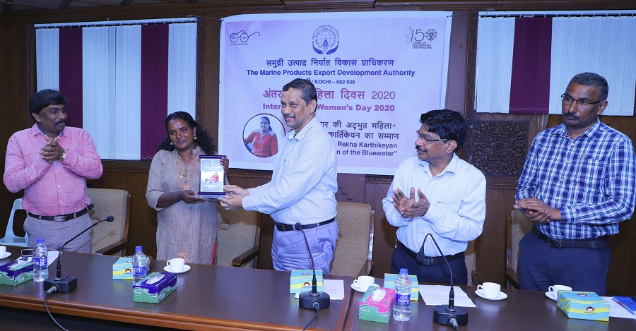 The Marine Products Export Development Authority (MPEDA) today felicitated the country’s first woman with deep-sea fishing licence, with the statutory body’s Chairman K S Srinivas hailing Rekha Karthikeyan of Thrissur district for excelling in what is conventionally a male domain.