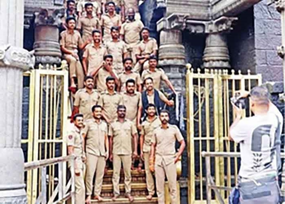 The picture was taken on Saturday which shows about 28 policemen in uniform with their backs to the sanctum sanctorum, which according to customs and traditions is a gross violation according to the devotees and believers of Lord Ayyappa, the temple deity.