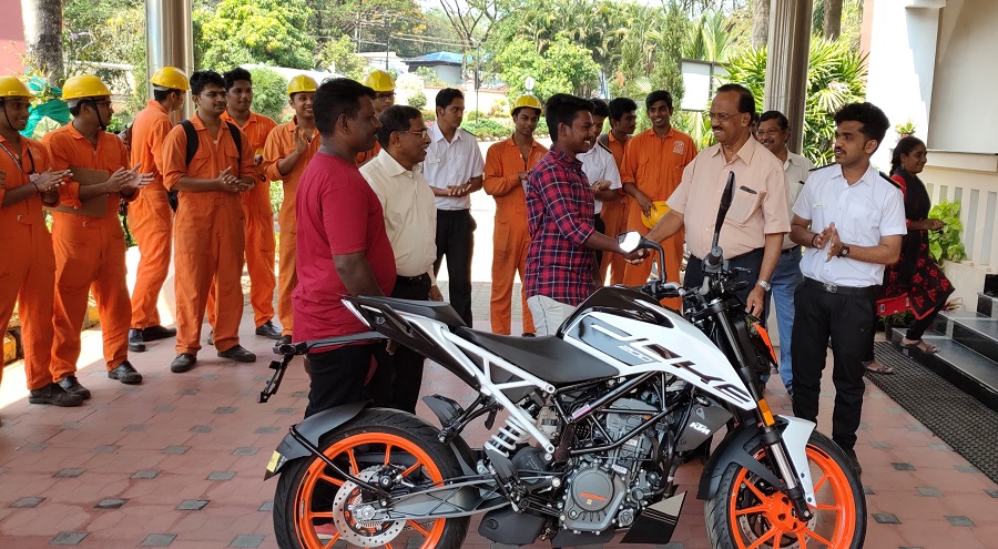 The first prize winner Mithun Manoj from Kottayam was handed over the key of K.T.M. Duke bike by the K.M. School Course in-charge Prof. N.G. Nair. K.M. School Head Prof. M.P. John, students and staff were present