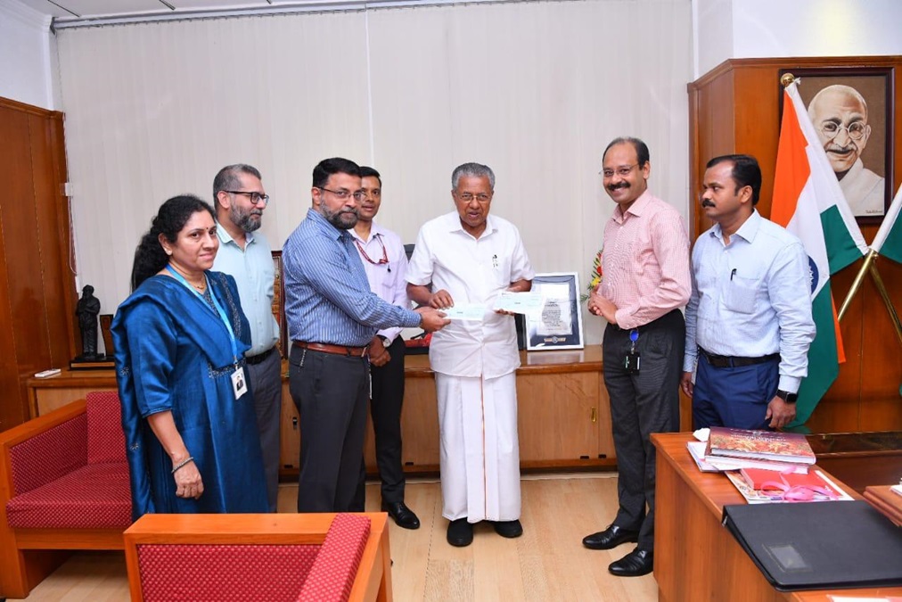 Chief Minister Pinarayi Vijayan received the cheque for Rs 2.1 crore from Col Sanjeev Nair (Retd), CEO, Technopark, and Susanth Kurunthil, CEO of Infopark and Cyberpark, in the CM’s Chamber at the Secretariat here.