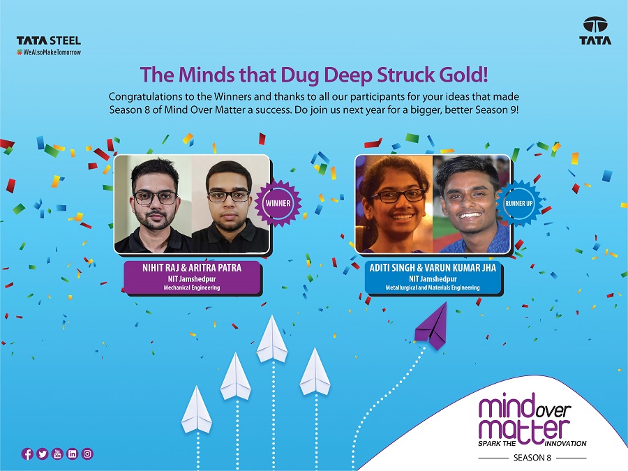 Tata Steel announced the season 8 winners of its much-awaited annual innovation challenge for engineering students, ‘Mind Over Matter’. Like last year, the grand finale and the award ceremony was organised using virtual platforms on August 6, 2021 owing to the prevailing Covid restrictions. The finale saw a total of top 5 teams present their innovative solutions to the esteemed jury. A total of 350+ teams participated in this season.