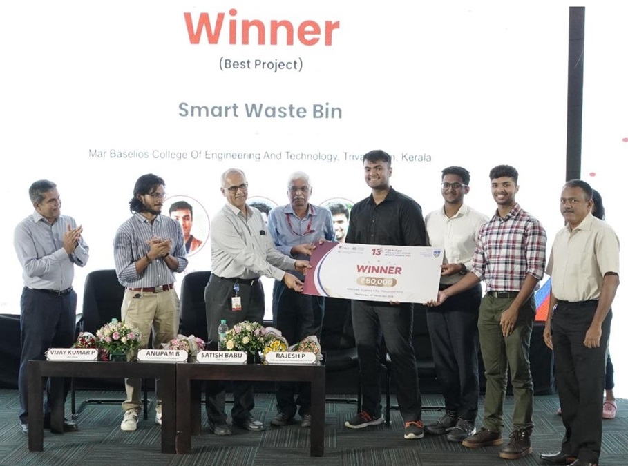 The smart waste bin project conceived by Bryan Bishi, Abraham AV, and Jins K Varghese of Mar Baselios College of Engineering received the award at a function held at Travancore Hall, Technopark here.