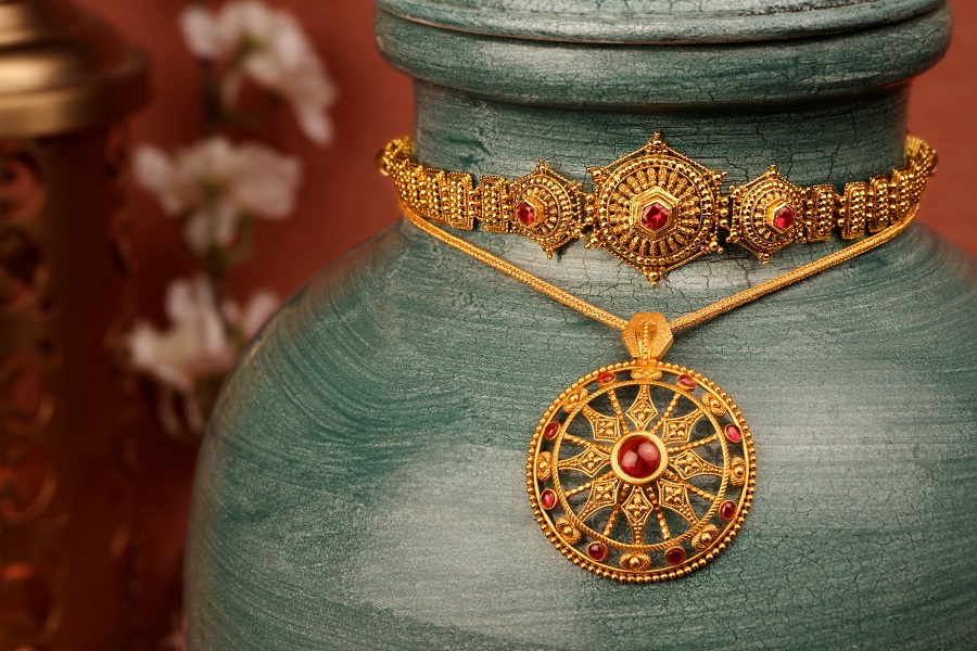 The exquisite choker, a seamless blend of Indian elements in traditional patterns and a hint of modernity gives rise to a stunning necklet. The red accent makes it even more complete and a smart choice.