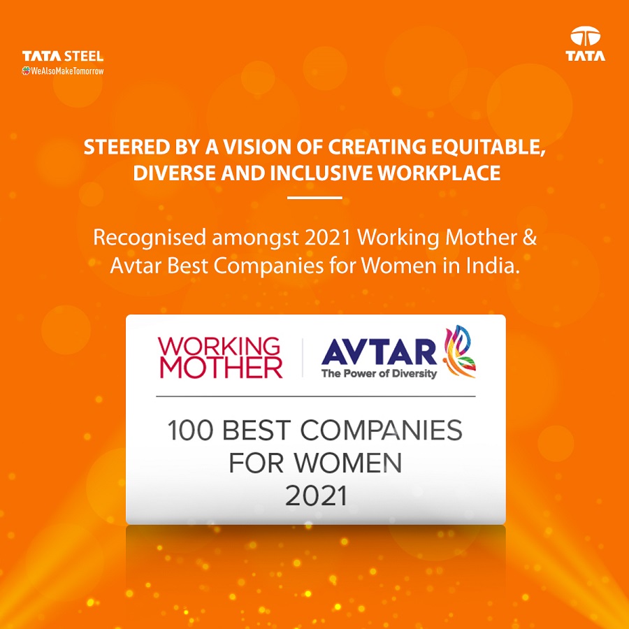 Tata Steel has been recognised amongst 100 Best Companies for Women in India (BCWI) in 2021 by Working Mother & Avtar.