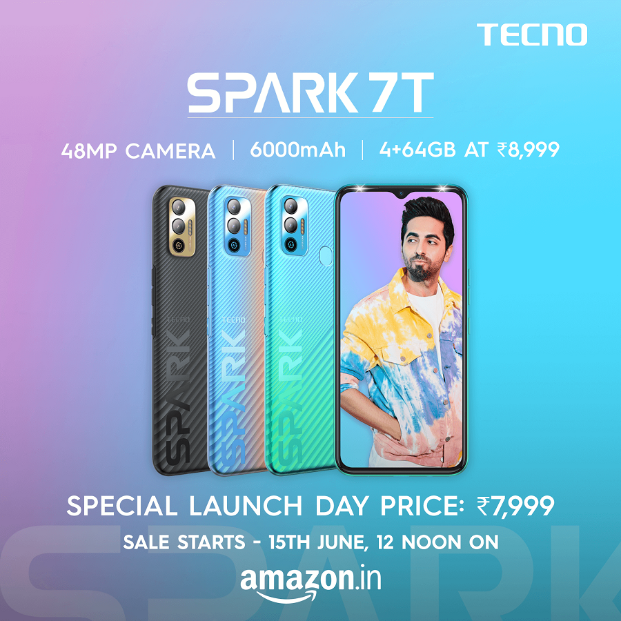 TECNO’s popular SPARK range of smartphones are known for their best-in-class design, display, camera and overall smartphone experience in the affordable segment. TECNO SPARK 7T flaunts many category defining features such as segment-first 48MP AI Dual real camera, Best 6000 mAh battery, Big 6.52- inch HD+IPS Dot Notch Display and a 4GB RAM at a disruptive price point of INR 8999. To sweeten the deal further, TECNO has announced a consumer launch offer of flat 1000 off on the first day of Spark 7T sale, so that consumers can buy the new smartphone at just INR 7999 for that day.