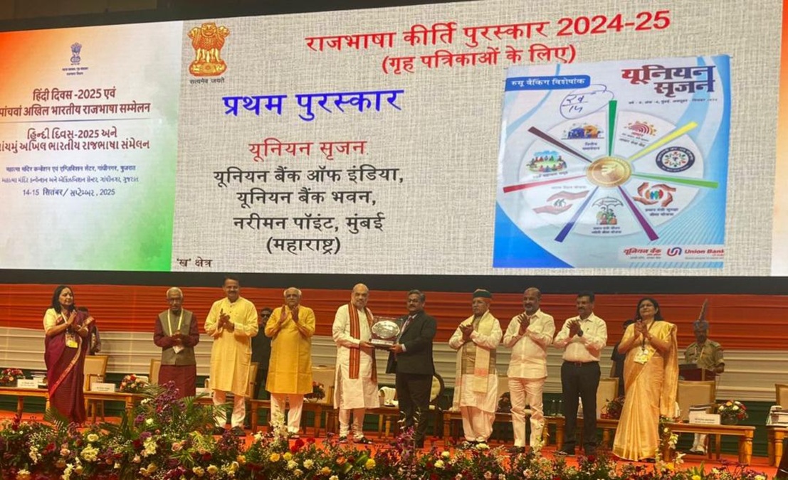 Amit Shah, Union Minister of Home Affairs & Co-operation presented the Kirti Puraskar award to the Bank for first prize in House Magazine – Union Srijan. The Award was received by Nitesh Ranjan, Executive Director of the Bank at the 5th All India Official Language Conference held at Gandhinagar, Gujarat on 14.09.2025.