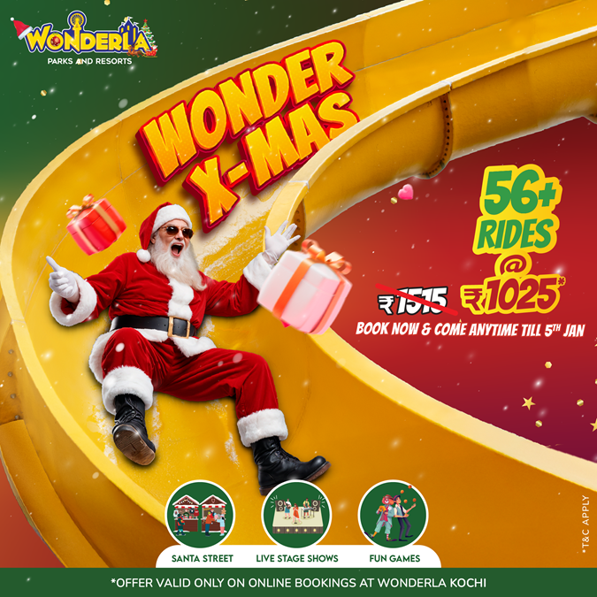 From December 21st, Wonderla Kochi will host a vibrant Christmas Carnival, featuring exciting games, live stage shows, and much more. A key highlight of the festivities is ‘Santa Street,’ running from December 21st to 28th, where visitors can meet Santa Claus and enjoy an immersive Christmas