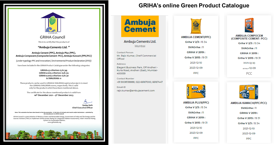Ambuja’s products have been evaluated based on the various 3rd party test results, benchmarks and environmental certifications etc. This evaluation was successfully completed by GRIHA Council for all of Ambuja’s blended cements manufactured from all of their plants & GU’s across the country.