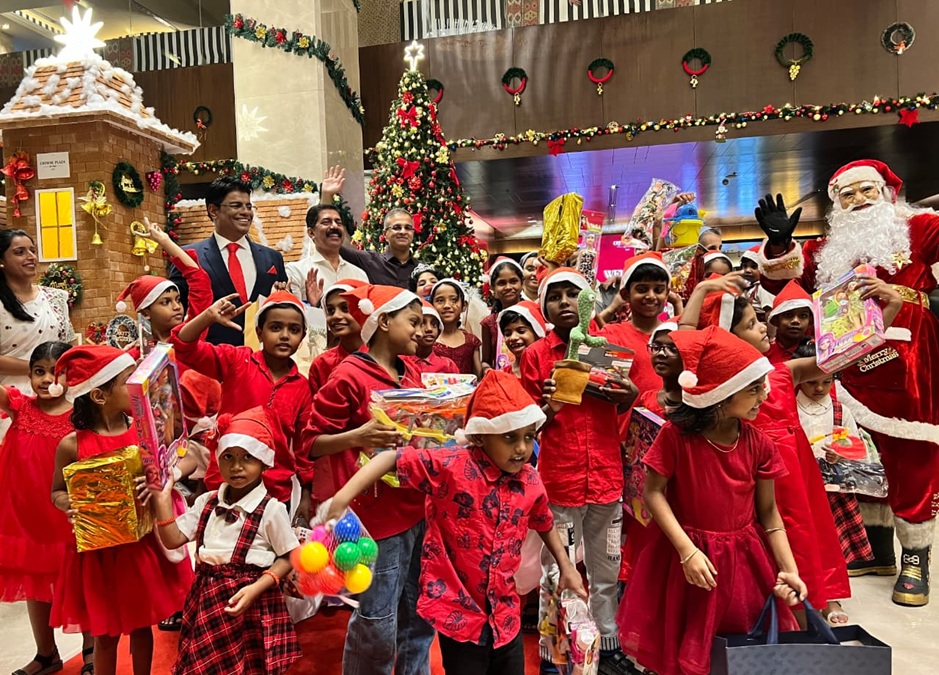 The ceremony unfolded in a beautifully decorated lobby where golden hues, twinkling lights, and vibrant ornaments set the tone for the evening and these décor pieces were made by Raksha Society for the Care of Children with Special Needs. The celebrations began with a soulful choir performance by children from The Choice School, creating a magical atmosphere. This was followed by a series of delightful activities, including a gingerbread house, dazzling wreaths, and a variety of Christmas-themed decorations.