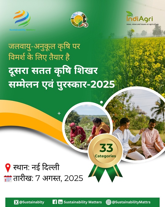 Inspired by the vision of Prime Minister Narendra Modi for a Viksit Bharat by 2047, the second edition of the Sustainable Agriculture Summit and Awards will be organised on 7 August 2025 in New Delhi. Themed ‘Krishi 2047: Climate-Ready Farming, Future-Ready Bharat’, the summit is being hosted by Sustainability Matters and IndiAgri. The event will bring together policymakers, scientists, entrepreneurs, development organisations, corporates, and progressive farmers from across India to deliberate on the future of climate-resilient agriculture.