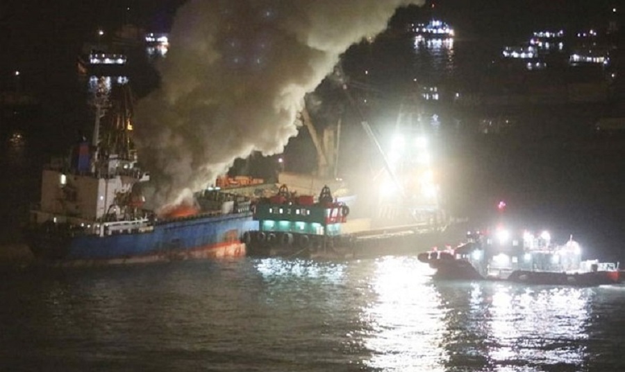 The fire erupted at 5:26 p.m. on Wednesday at the vessel carrying metal scrap in waters south of Tsing Yi and was upgraded to No. 3 alarm (No. 5 alarm is the highest) at 11.09 p.m., Xinhua news agency quoted the government as saying.