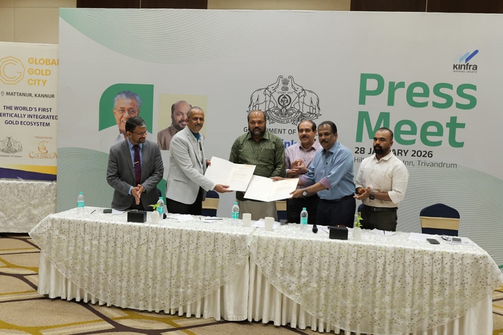 GCC is conceived as a smart industrial city unifying the entire gold value chain from refining to physical trading in a single ESG-compliant high-tech zone. The MoU was signed between KINFRA MD Santhosh Koshy Thomas and S Taruj, Managing Director of Goldsikka Pvt Ltd, in the presence of Minister for Industries, Law and Coir P Rajeeve.
