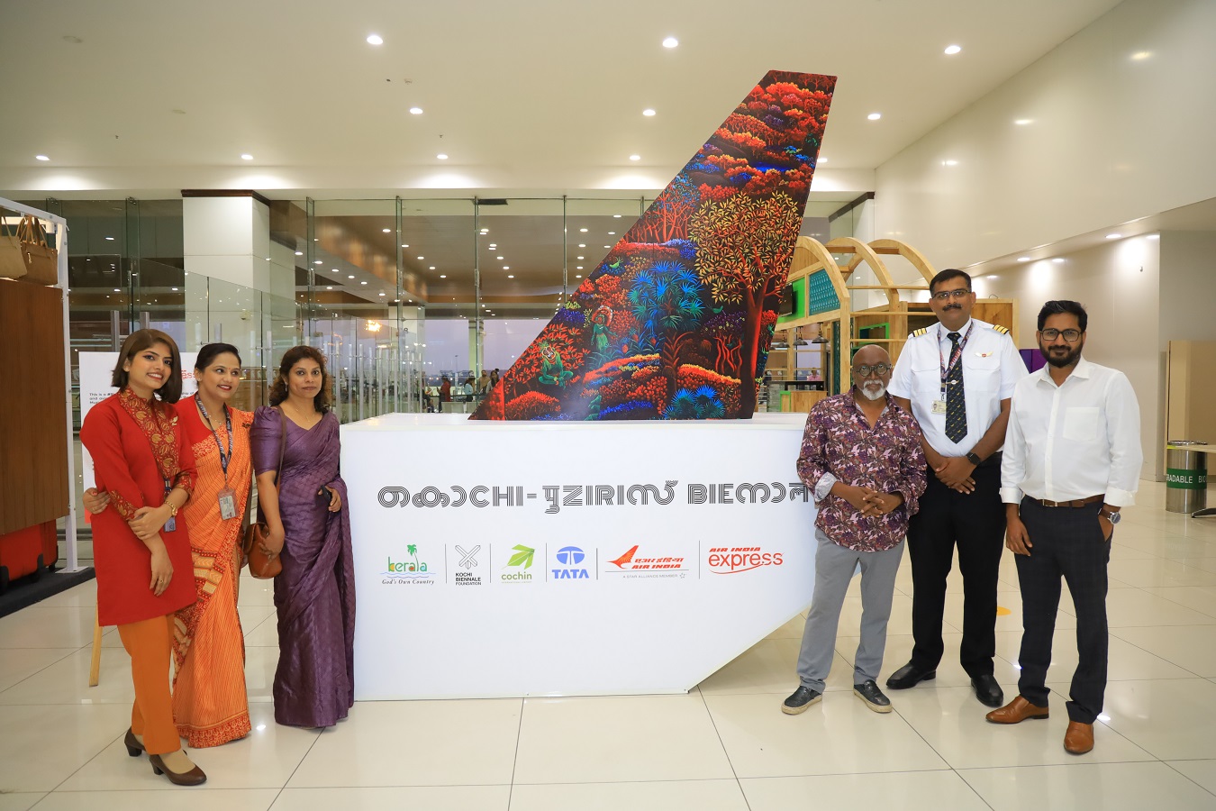 The replica of the tail art installed at Terminal 3 of the Cochin International Airport (CIAL) served as the backdrop for the aesthetic event. Bose Krishnamachari, President of Kochi Biennale Foundation was the Guest of Honour and Manu G, Airport Director was also present.