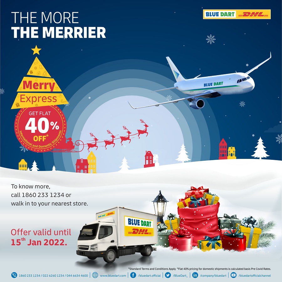 Ketan Kulkarni, Chief Commercial Officer, Blue Dart, corroborates this by saying, “Blue Dart has always provided its customers with value-based services that are designed with a keen focus on providing solutions for their logistics requirements even before the need arises. The offers that we launch, especially during the festive season, aim to spread joy and warmth that is associated with the festivities. COVID-19 has been instrumental in making the world a bigger place and enhanced distances between loved ones, which were otherwise easy to navigate around. Our goal, as the nation’s trade facilitator, is to make India and the world a smaller place. The ‘Merry Express’ and ‘Assured Gift’ Offers are a step forward in this direction.”