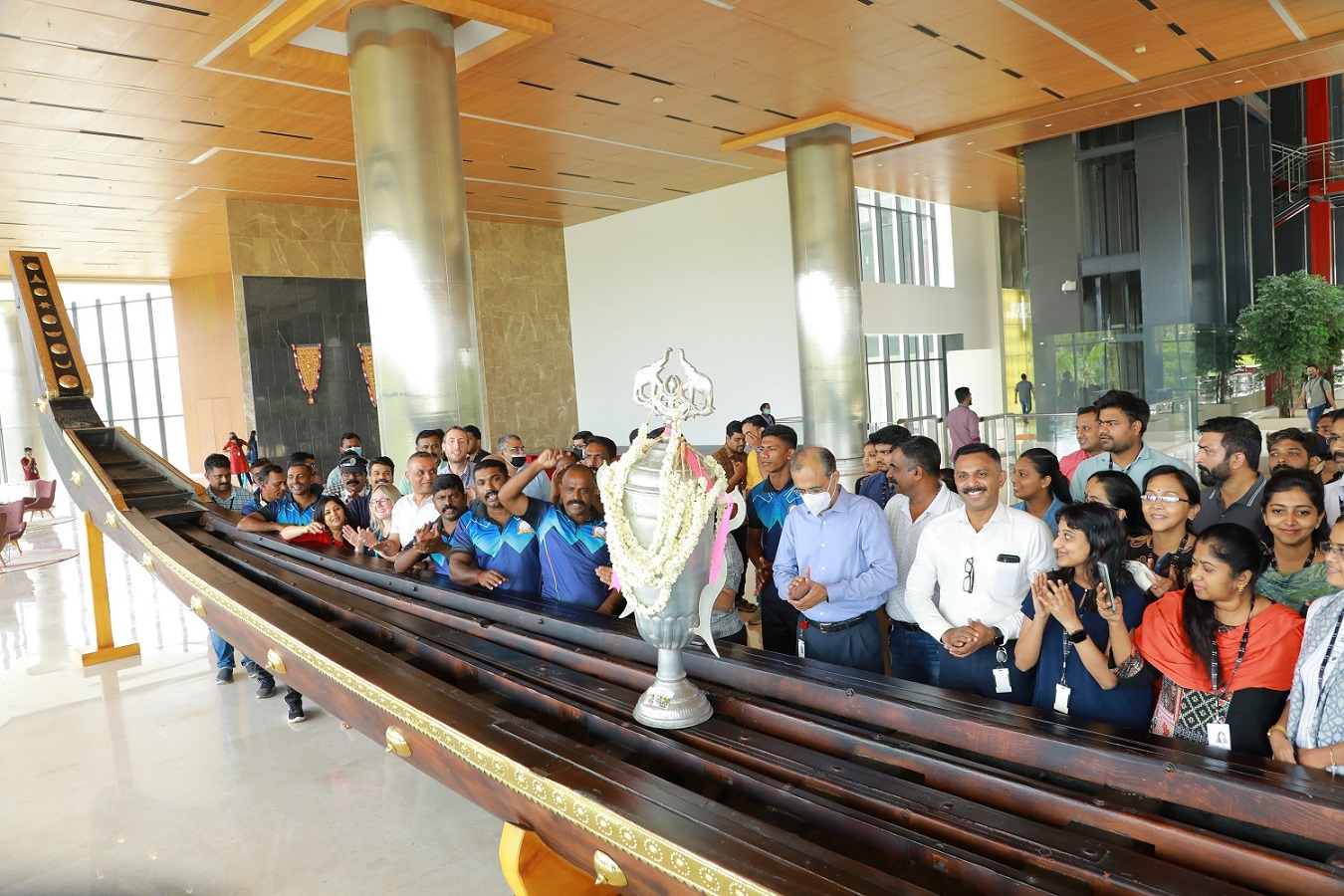 At the Champakulam Moolam Boat Race held on July 12, the Kerala Police Boat Race team won the Raja Pramukhan Trophy atop the latest generation Champakulam Chundan boat. In recognition of the winning team’s appreciation and gratitude, and on the invitation from UST, the Kerala Police Boat Race team, the rowers of the Champakulam Chundan, visited the old Chundan adorning the UST campus Thiruvananthapuram campus.