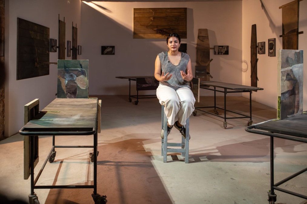 As Dodiya explains, the work began with a historical rupture: “Reading about the 1341 Kerala deluge was an important beginning point for the project because I started thinking about the collapse of Muziris and the emergence of Kochi, the cycle of life and death and how opposing forces charge our reality. The medical stretcher and basketball backboards, two opposing motifs that evoke very different relationships to our physicality, anchor the installation. Together they make a fictional space, one symbolizing stillness and loss, the other winning, movement, power.”