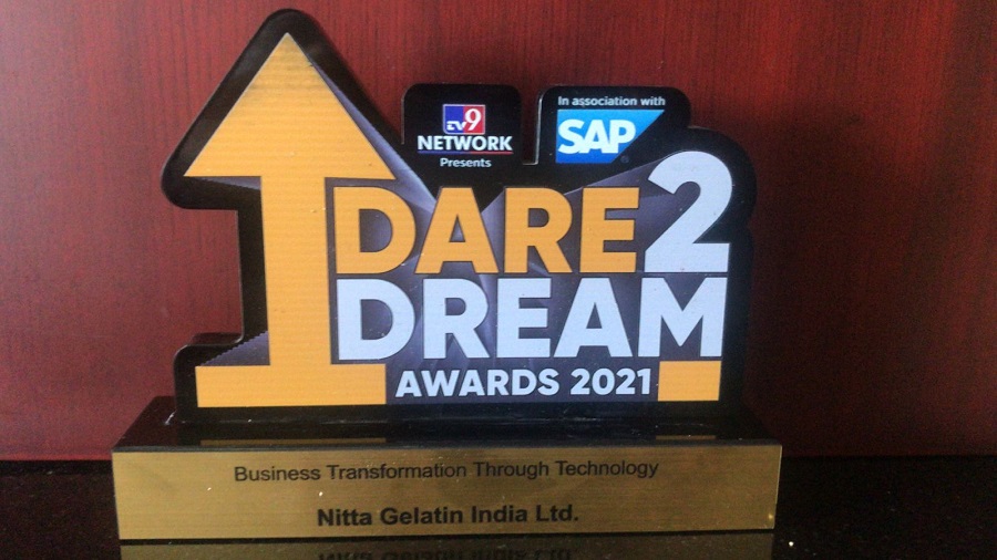 Nitta Gelatin India Limited has bagged the Dare 2 Dream Award 2021 for business transformation through technology instituted by SAP India and TV9 Network. The awards are given to recognise business leaders who had the resilience to not only tide over the pandemic induced crisis but also come out stronger by resetting their business models. Sajiv K. Menon, Managing Director, Nitta Gelatin, received the award from S. Krishnan IAS, Industries Secretary, Government of Tamil Nadu.